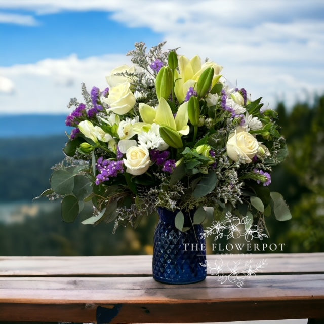 Blooms such as crème roses, graceful white oriental lilies, white alstroemeria, a white disbud mum, purple statice and lavender limonium are accented by seeded eucalyptus and salal in a stunning cobalt blue glass vase