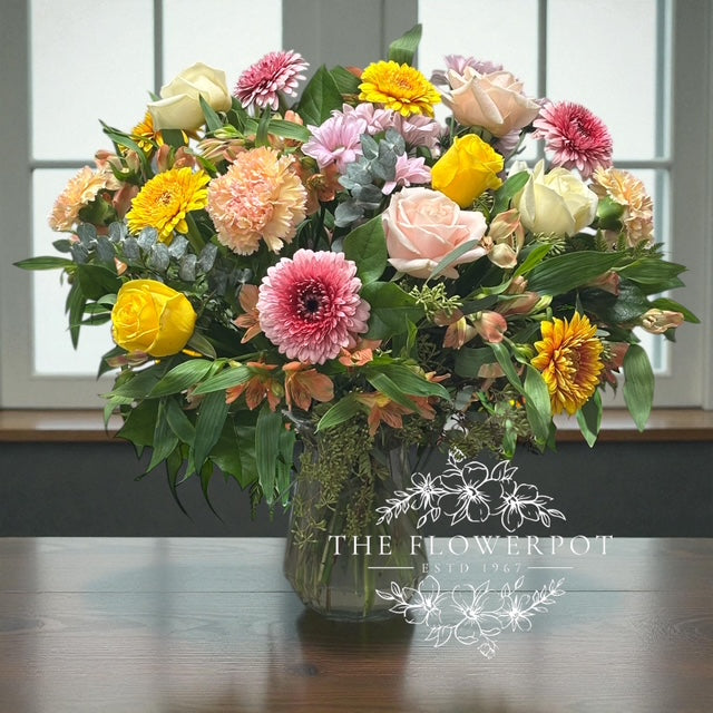 Like freshly squeezed lemonade on a hot sunny day, this bright and cheerful bouquet is a summer sensation. Yellow, pink and white roses, peach carnations, pink and yellow gerbera daisies, chrysanthemums and greens lovely glass vase. It's a kiss of summer!