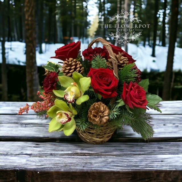 Introducing "Wilds of Winter"—the ultimate cozy Christmas floral arrangement! This festive beauty brings the warmth of the holiday season indoors with its vibrant mix of rich red roses, hypericum berries, and carnations. Spruced up by the lush green textures of holiday greenery sprinkled with 2 beautiful orchids .