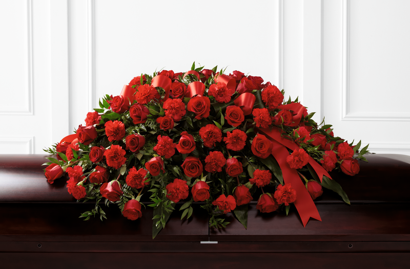 A traditional tribute that communicates deep love and eternal commitment. This dramatic red mixed flowers and greenery to remember that bold, vibrant loved one.