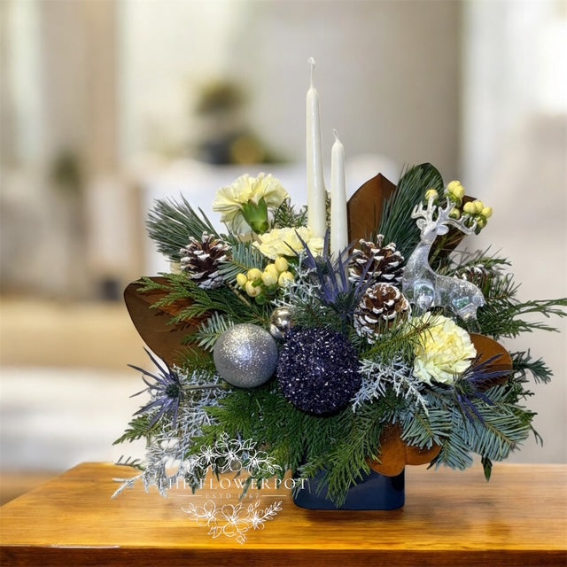 Celebrate the magic of the holidays with Season of Sapphire, a luxurious handcrafted arrangement designed to bring winter’s beauty indoors. This striking centerpiece blends deep evergreen foliage with soft cream blooms, frosted pinecones, and shimmering accents that evoke the quiet sparkle of a snowy evening.