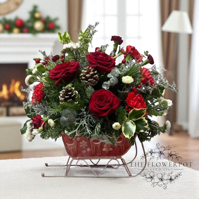 All aboard for Christmas fun! This sweet metal sled joyfully delivers a bevy of holiday blooms to brighten any winter's day.