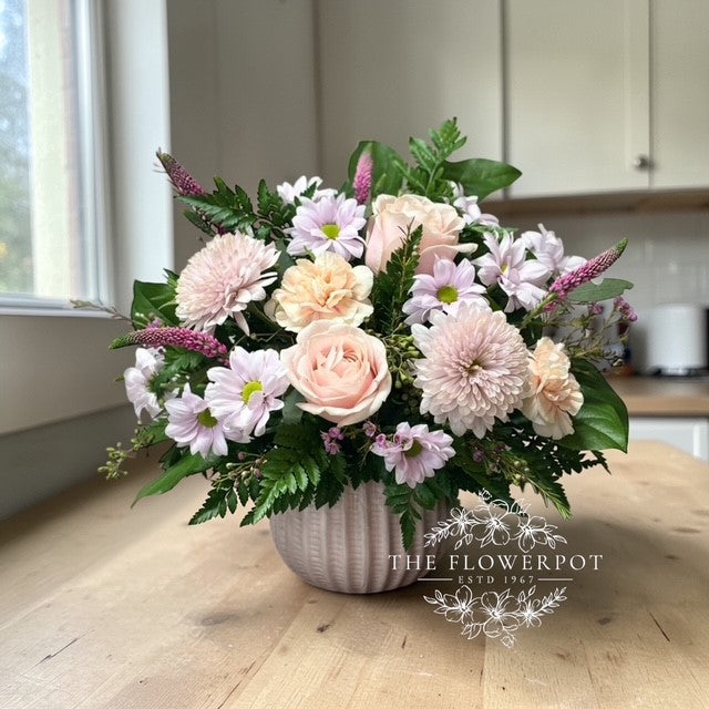 Soft, graceful, and full of heartfelt charm, So Very Loved is a delicate celebration of beauty and tenderness. Designed in a timeless ceramic vessel, this arrangement blends romantic blush roses with airy pastel blooms and fresh seasonal greenery for a look that feels both elegant and comforting.