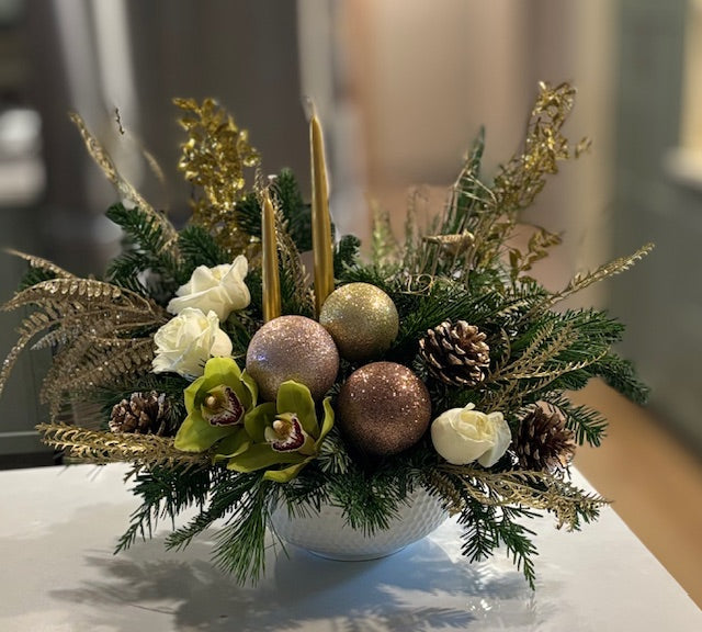 This stunning holiday arrangement is a true celebration of the season, blending elegance and festive charm. Nested in a chic white dish with winter greens, this display features white roses, striking green orchids, and two gold tapered candles.